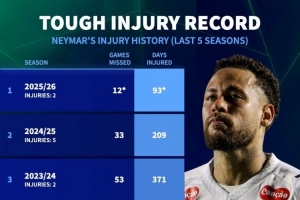 玻璃人!内马尔近5个赛季受伤15次,总计伤缺929天、139场比赛